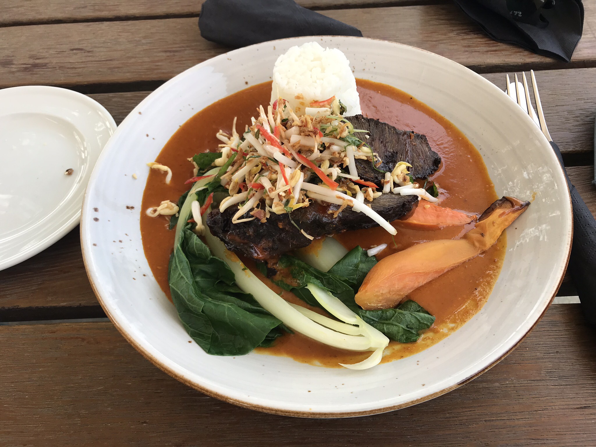 Smoked Beef served with carrot, bak choy, bean sprouts and rice. Yum!